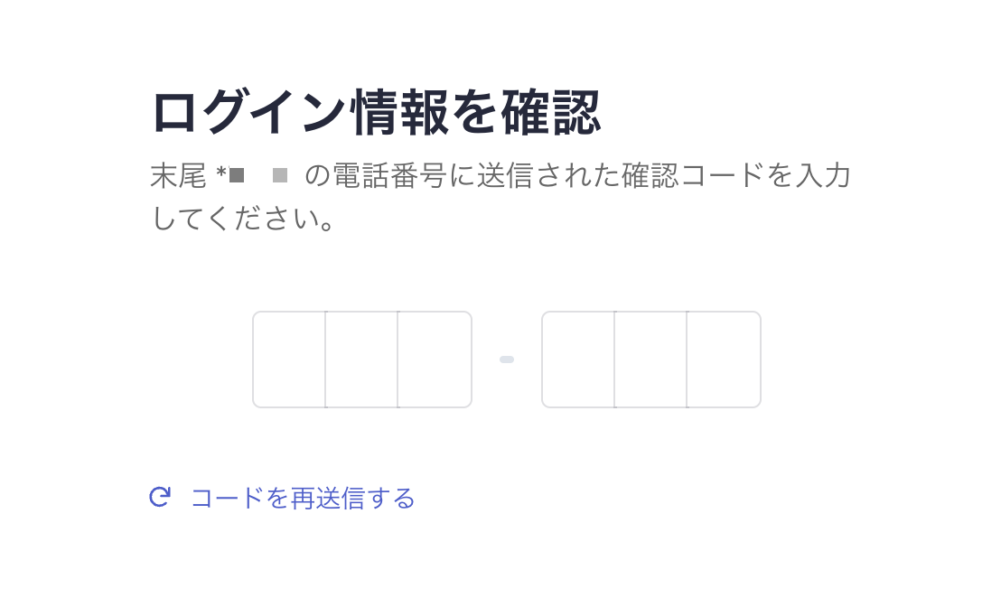 ログイン情報を確認 電話番号に送信された確認コードを入力してください。